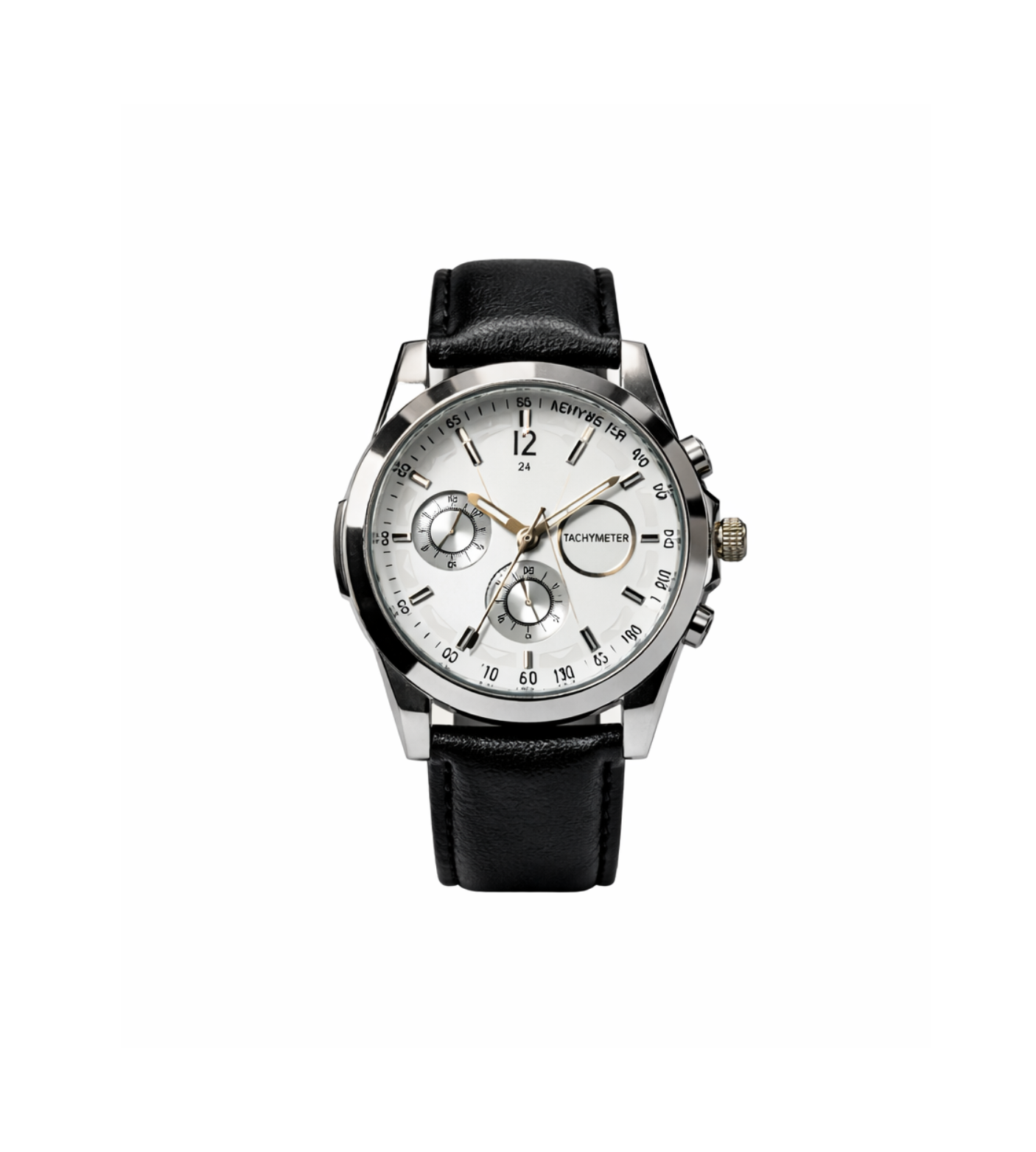 Men’s Chronograph Analog Watch with Tachymeter White Dial & Black Leather Strap