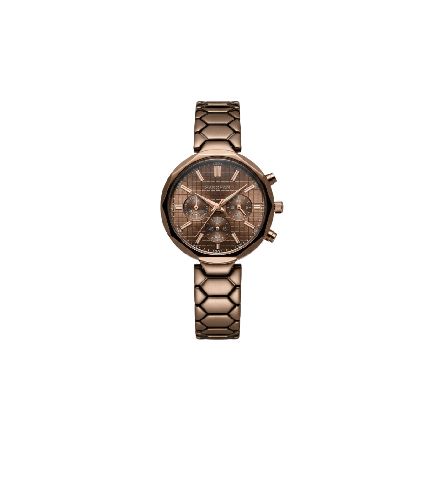 SANGEAN Women’s Coffee Bronze Chronograph – Luxury Textured Dial Watch with Scalloped Link Bracelet