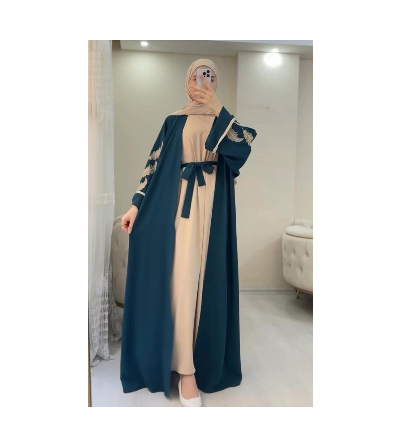 Teal and beige two piece embroidery abaya set with shawl